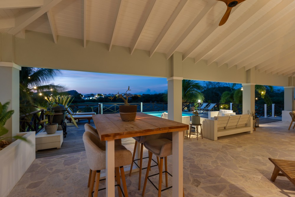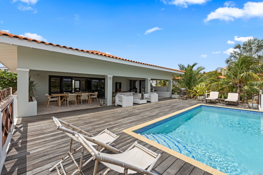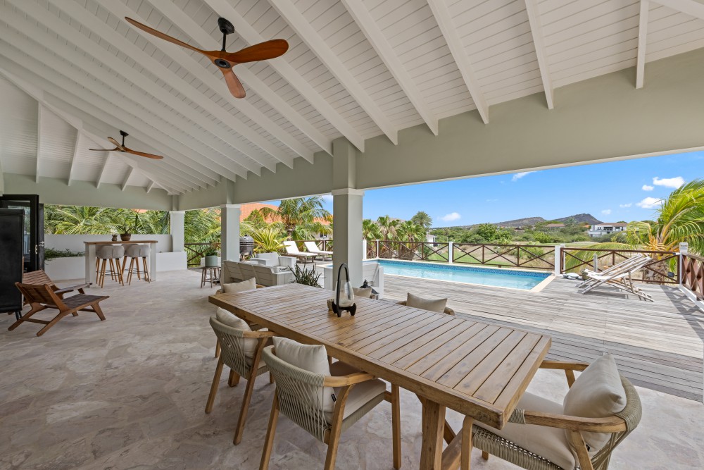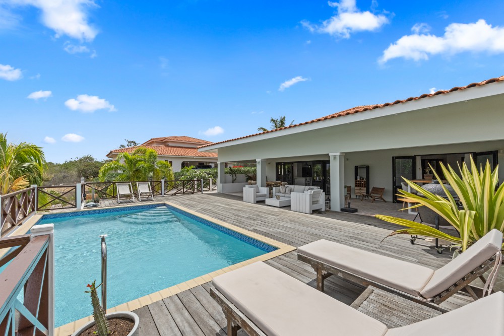 Luxury 5-Bedroom Villa with Private Pool in Blue Bay Golf & Beach Resort Curacao, featuring golf course views and a spacious terrace. This fully furnished home offers the perfect blend of space, ambiance, and comfort. Ideal for personal residence or (temporary) rental
