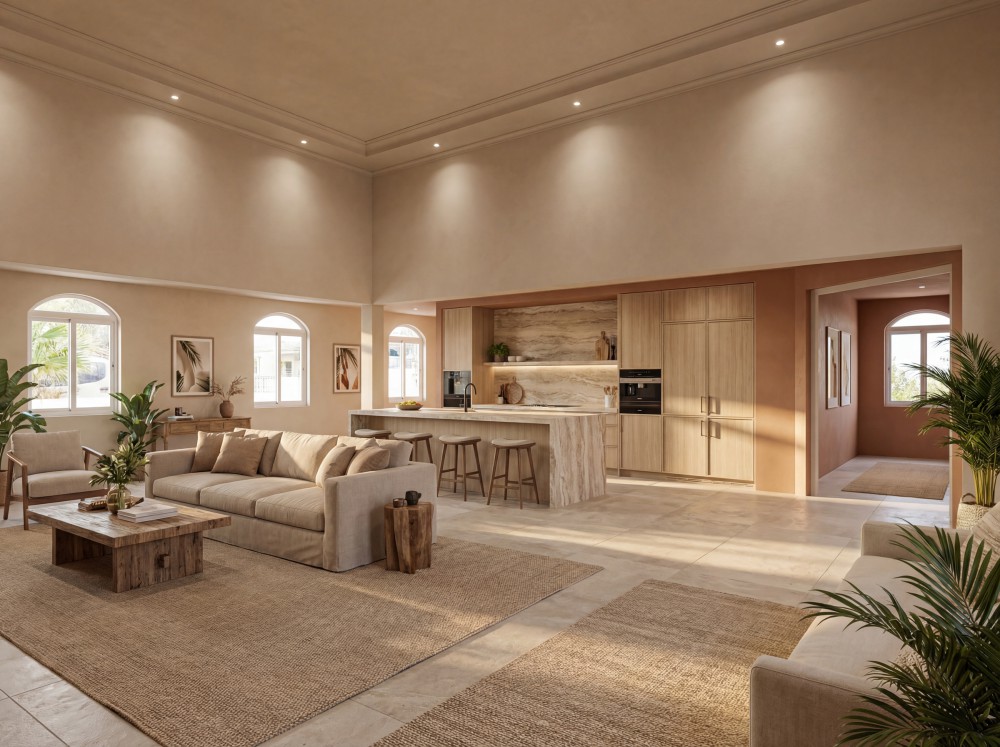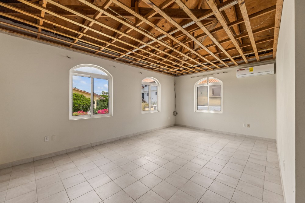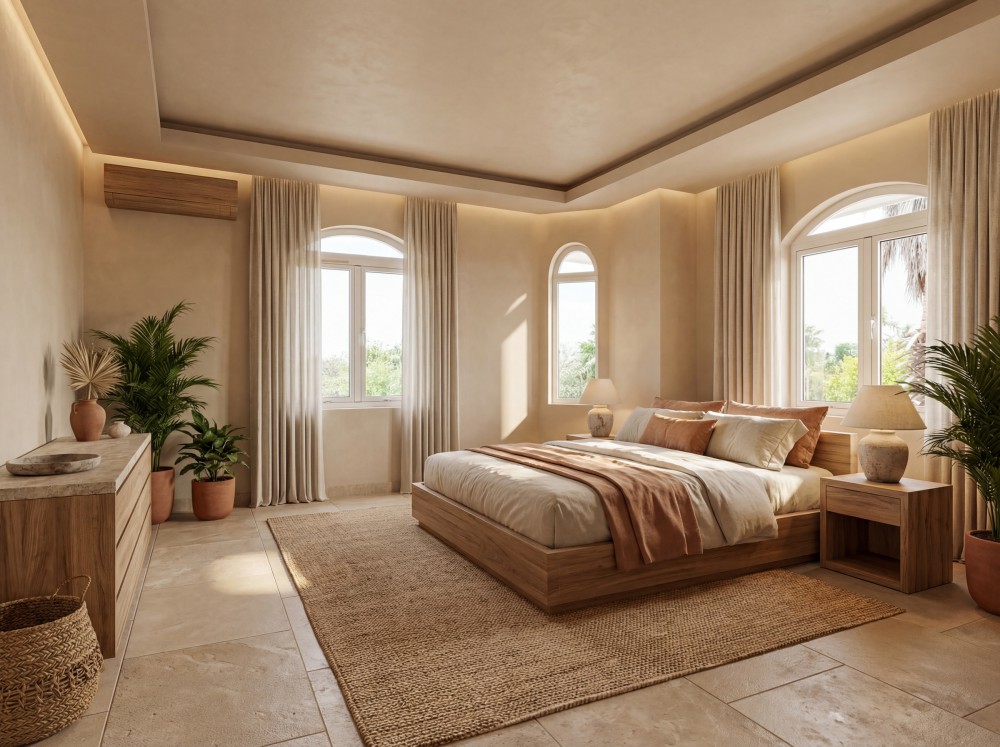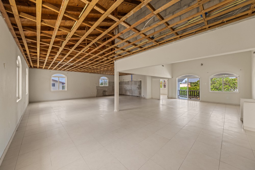 Via the staircase in the hallway, you reach the upper floor of the property. Here, you’ll find a large open space that can be customized entirely to your needs—whether as a spacious living room, kitchen, porch, or additional bedrooms. This floor already includes four bedrooms. The master bedroom features a large en-suite bathroom, while the other bedrooms share a guest bathroom.