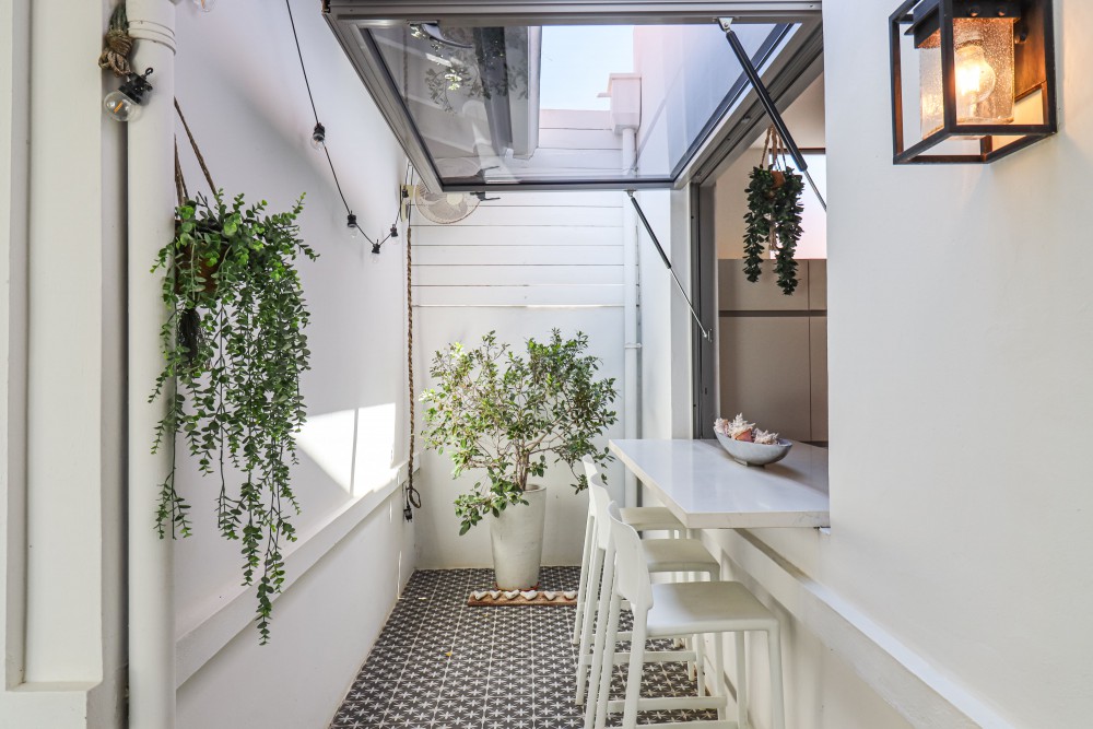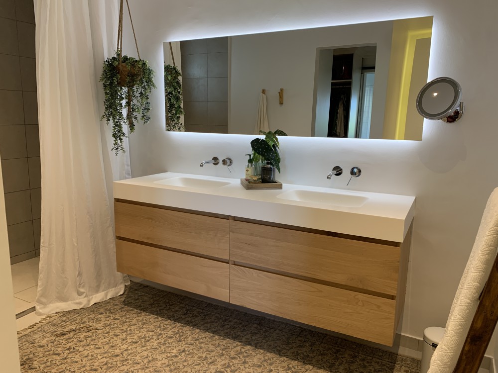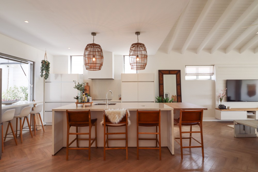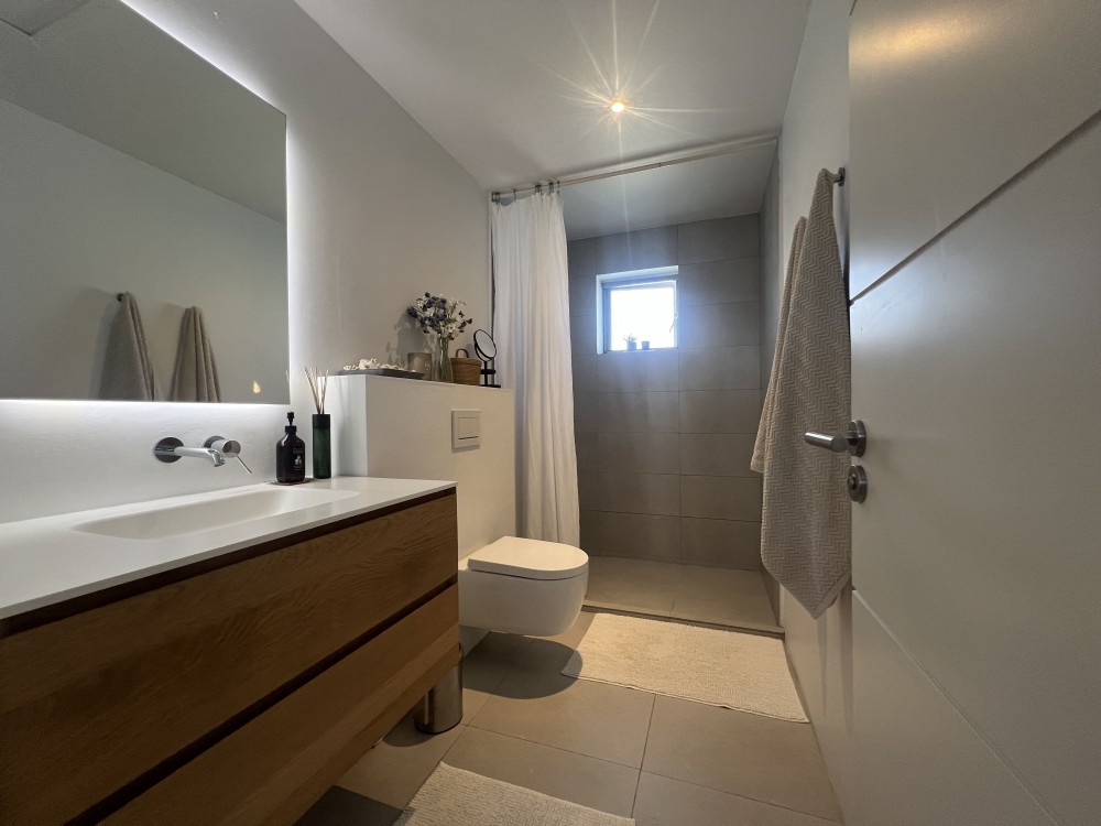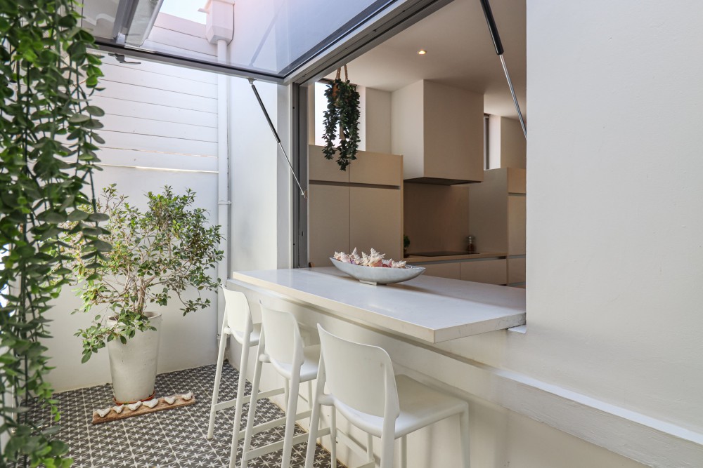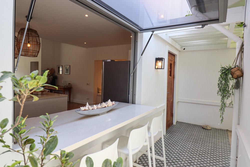 Furthermore, there is an open kitchen with a generous breakfast bar and modern appliances such as a Quooker tap, combination microwave/oven, and induction hob. The dining table is positioned half indoors/half outdoors and is perfect for cozy dinners with friends and family. This living space can be quickly cooled during the warm months of the year with its 2 air conditioning units.