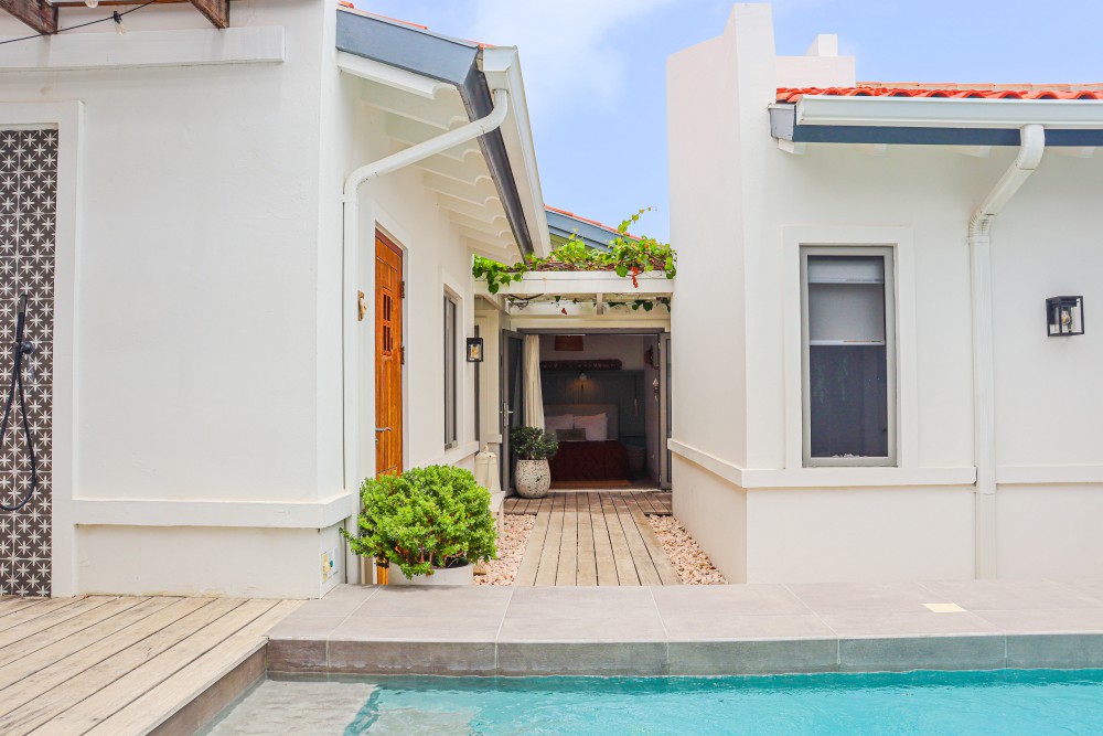 Two bedrooms are located in the main house, each with its own bathroom. The master bedroom features an en-suite walk-in closet and a spacious, luxurious bathroom complete with modern finishes. The second bedroom has a bathroom with a walk-in shower, a built-in wardrobe, and a view of the swimming pool.