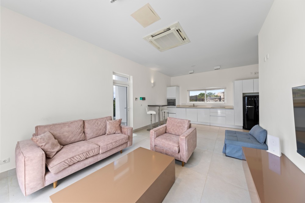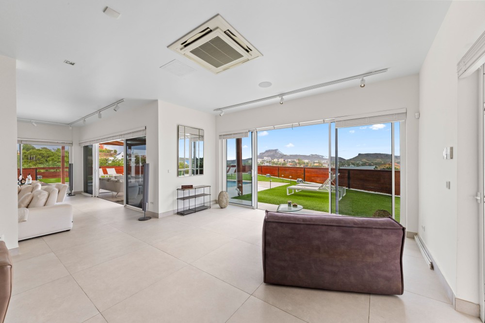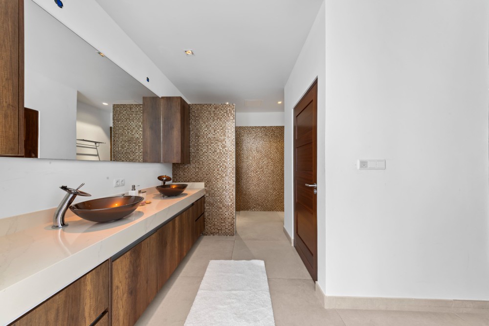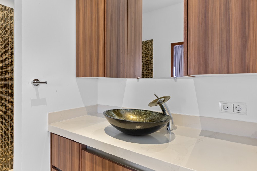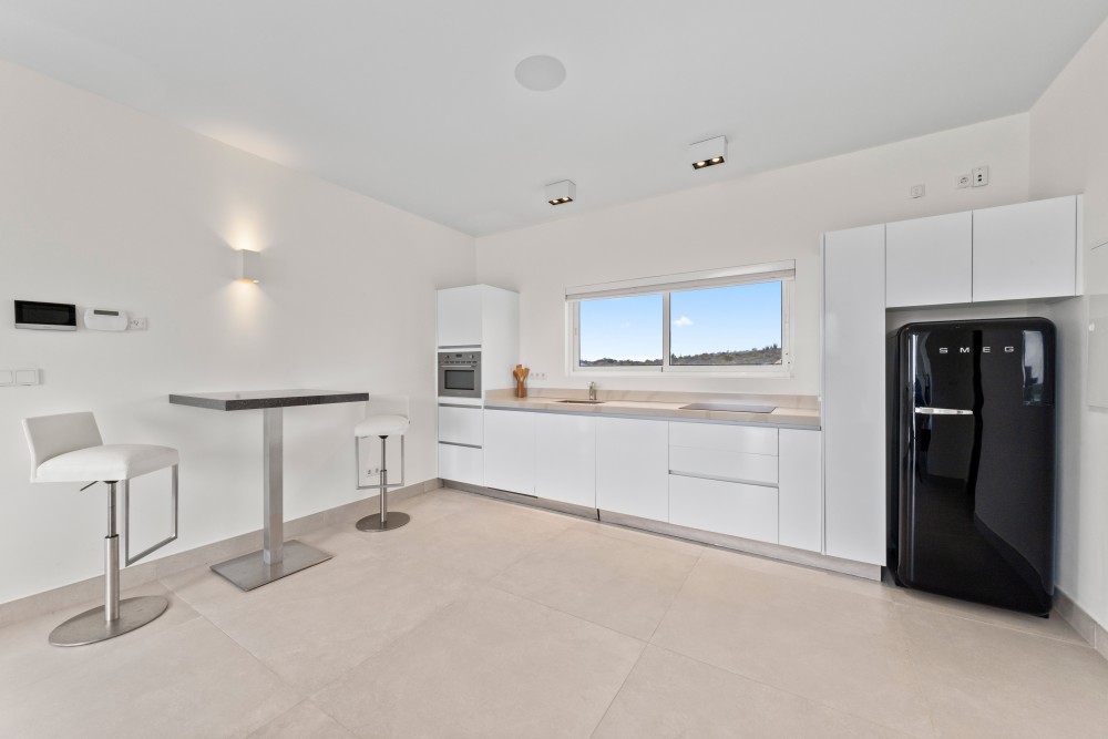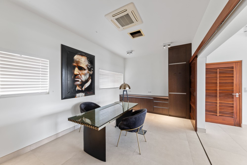 The villa’s ground floor features a spacious living and sitting room with direct access to the covered patio, a fully equipped kitchen, office space, pantry/storage, laundry room, guest toilet, and a garage.
