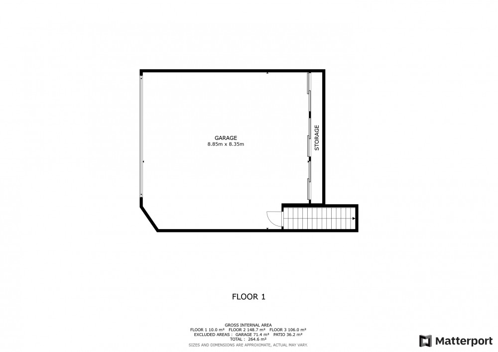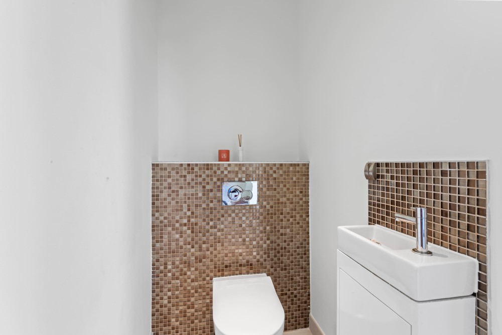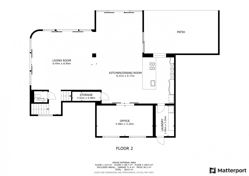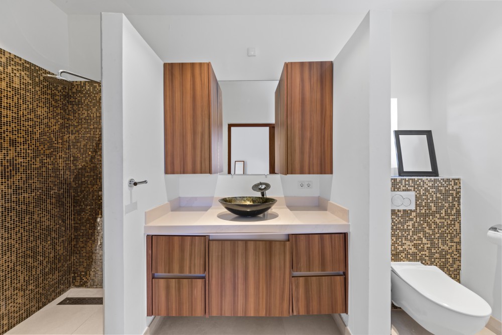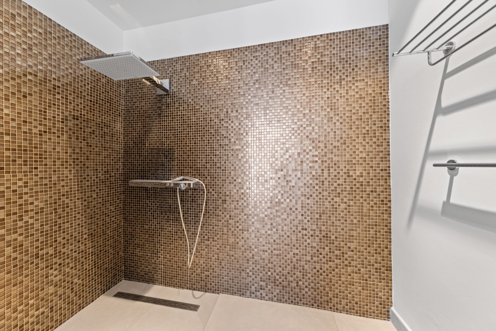 The villa’s ground floor features a spacious living and sitting room with direct access to the covered patio, a fully equipped kitchen, office space, pantry/storage, laundry room, guest toilet, and a garage.