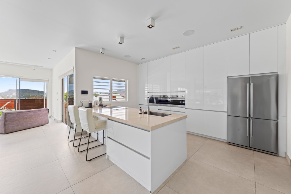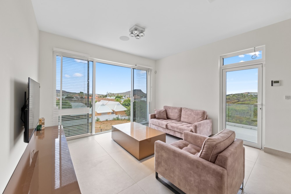 The first floor offers two bedrooms with a shared bathroom, plus a generous master suite with private bathroom, walk-in closet, and private balcony with stunning views over the surroundings, the Tafelberg, and the Spanish Water.