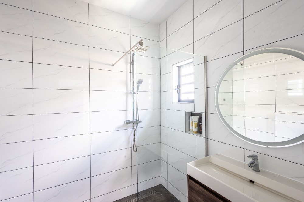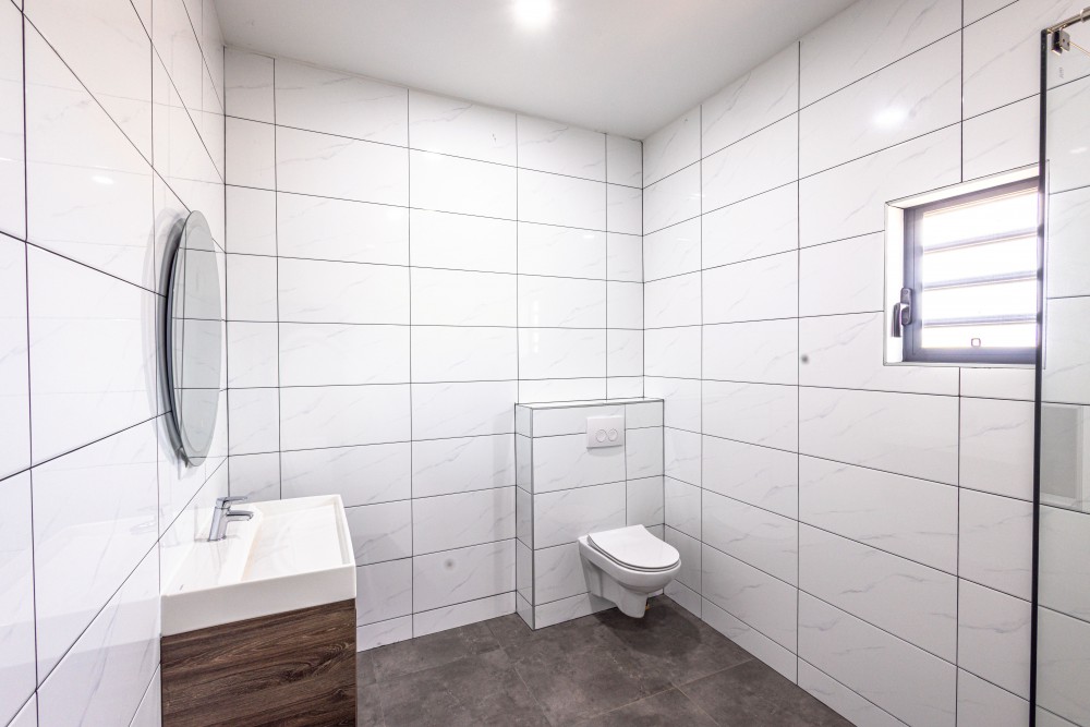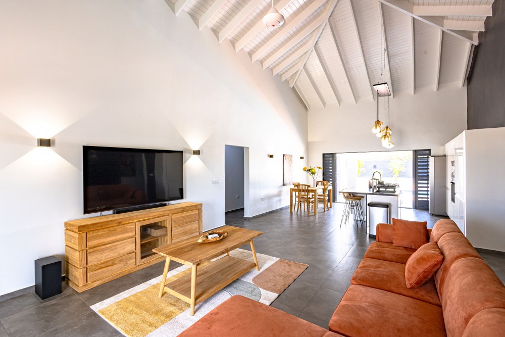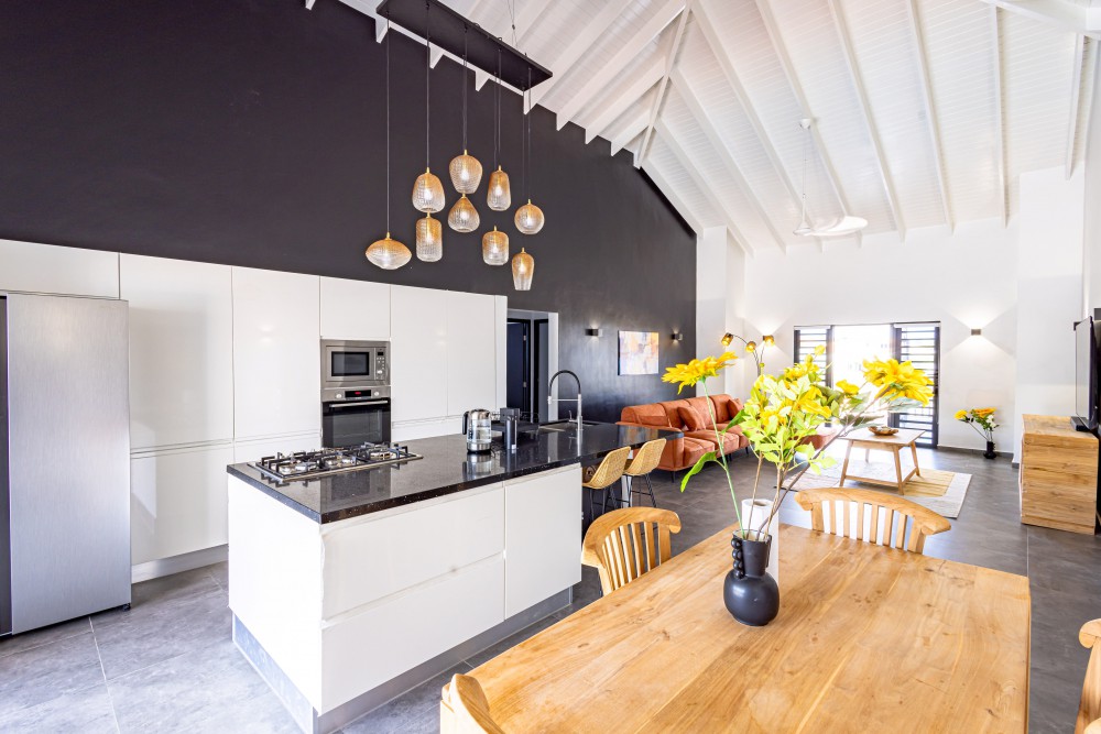The villa’s outdoor area is a true private paradise. At the back, you’ll find a spacious terrace with a large swimming pool and a separate gazebo featuring a bar area, toilet, and shower. From here, you can enjoy stunning panoramic ocean views and unforgettable Curaçao sunsets. It’s the perfect setting for relaxing, dining al fresco, or entertaining guests in total privacy.