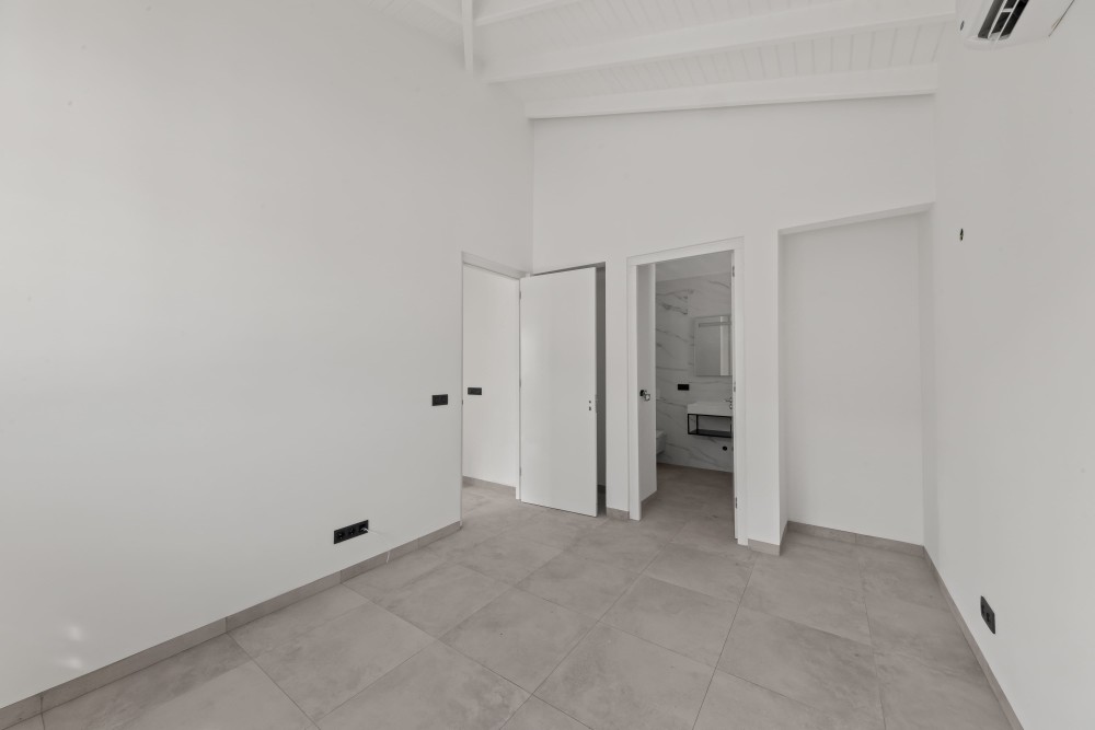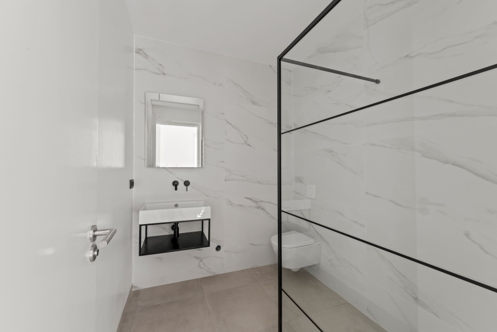 The first-floor apartment is finished to a high standard and is offered unfurnished, allowing you to furnish it entirely to your own taste. The apartment features a practical, efficient yet spacious layout, including a generous living room with an open kitchen, two bedrooms, and two bathrooms. Large sliding doors provide plenty of natural light and connect the living room to the porch, creating a seamless indoor-outdoor living experience.