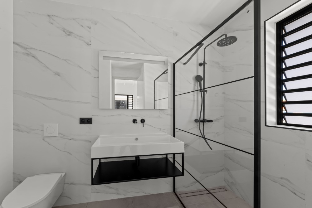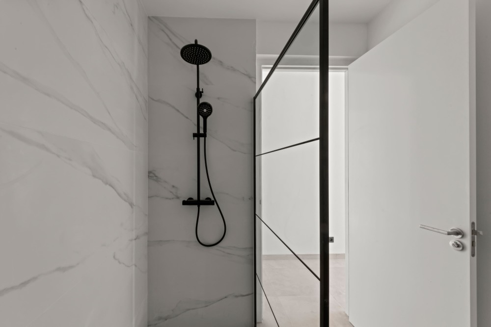 The living room and both bedrooms are equipped with modern, energy-efficient air conditioning, ensuring a comfortable living and sleeping environment. The bathrooms are finished with high-quality European sanitary fittings, including rain showers and modern fixtures, selected with comfort and durability in mind.