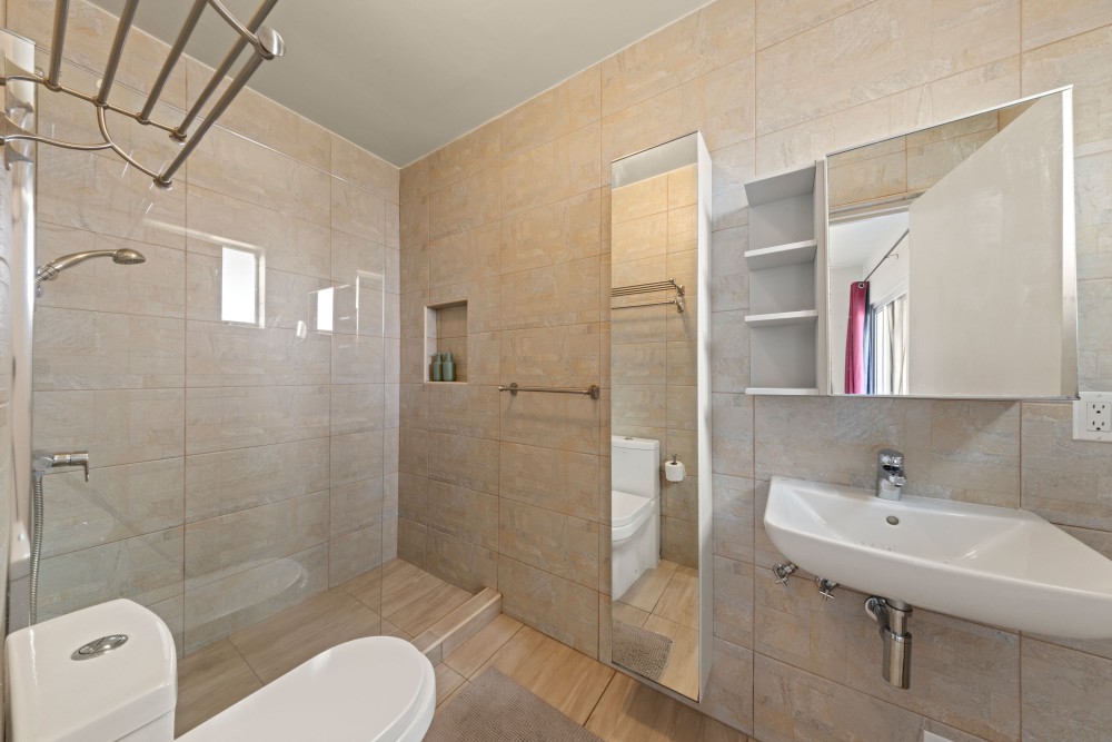 The apartment features a spacious living room with an open-plan kitchen that seamlessly connects to a large covered terrace. This outdoor area is a pleasant extension of the living space and offers the opportunity to enjoy the tropical climate year-round.