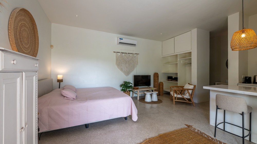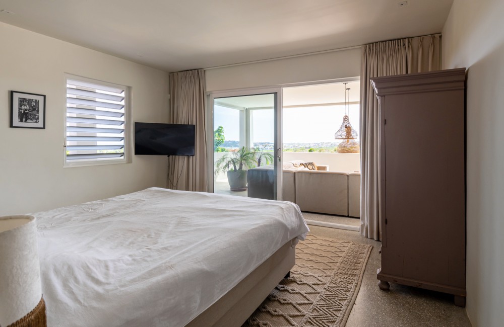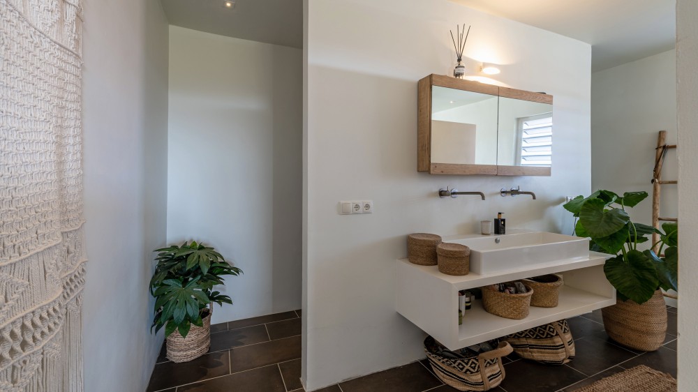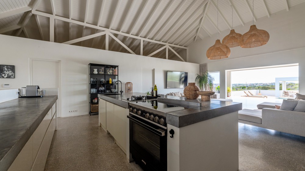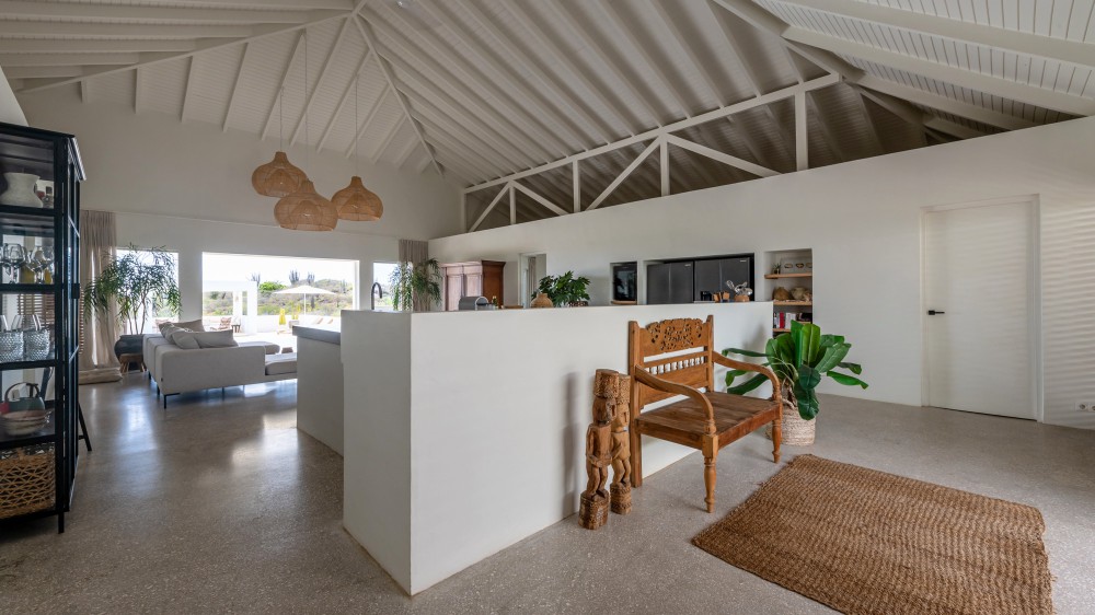 Bij binnenkomst valt meteen de ruime en lichtovergoten woonkamer op, met hoge plafonds, strakke lijnen en een open indeling. De naadloze verbinding met de keuken en het kookeiland versterkt het gevoel van moderne luxe. De keuken is volledig uitgerust met hoogwaardige apparatuur, royale werkruimtes en een stijlvol eiland, ideaal voor zowel dagelijks gebruik als culinaire avonden. Aan de voorzijde bevindt zich een terras met loungehoek, waar de verkoelende passaatwind zorgt voor een aangename bries die door de woning waait wanneer de shutterramen en -deuren geopend zijn.