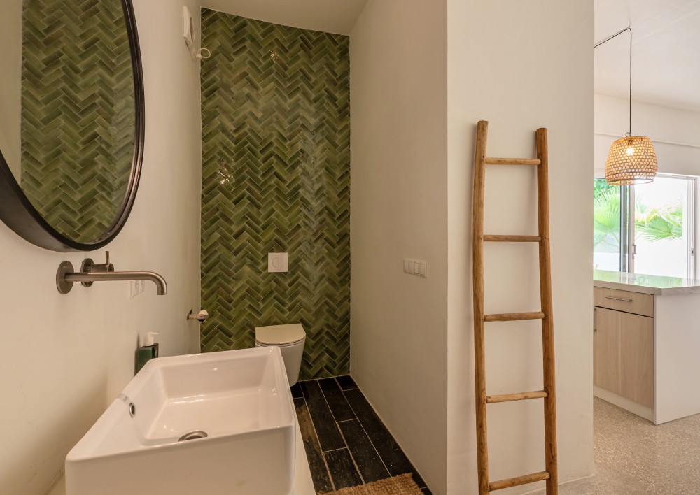 De hoofdwoning telt drie elegante slaapkamers die rust en comfort uitstralen. De master suite beschikt over een eigen badkamer, een walk-in closet en directe toegang tot het terras, waar u iedere ochtend wakker wordt met uitzicht over het water. De badkamers zijn modern ingericht met inloopdouches, stijlvolle wastafels en hoogwaardige details die het verblijf extra bijzonder maken.