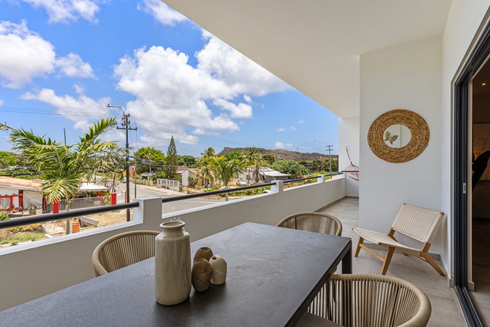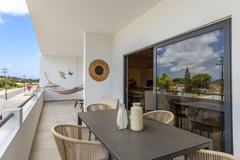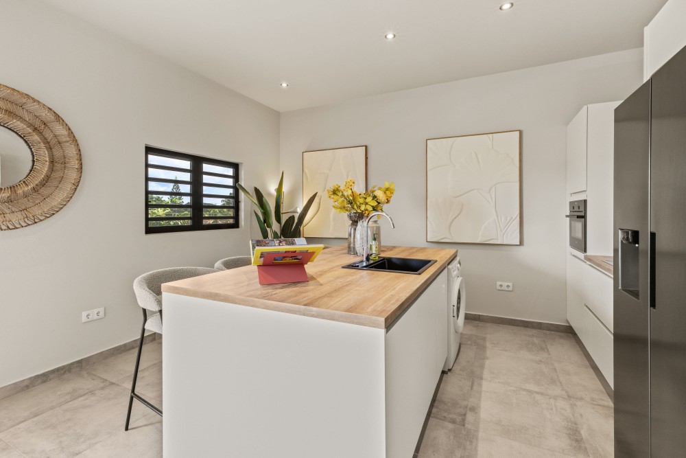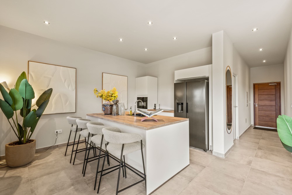 Via de trap aan de achterzijde van het complex heeft u toegang tot de appartementen. Door de lange gang komt u in de woonkamer. Alle appartementen beschikken over een stijlvolle open keuken met moderne inbouwapparatuur, waaronder een vaatwasser en inductiekookplaat. De glazen schuifpui zorgt voor een naadloze overgang naar het overdekte terras, ideaal om te ontspannen en te genieten van de tropische sfeer en een verkoelende bries.