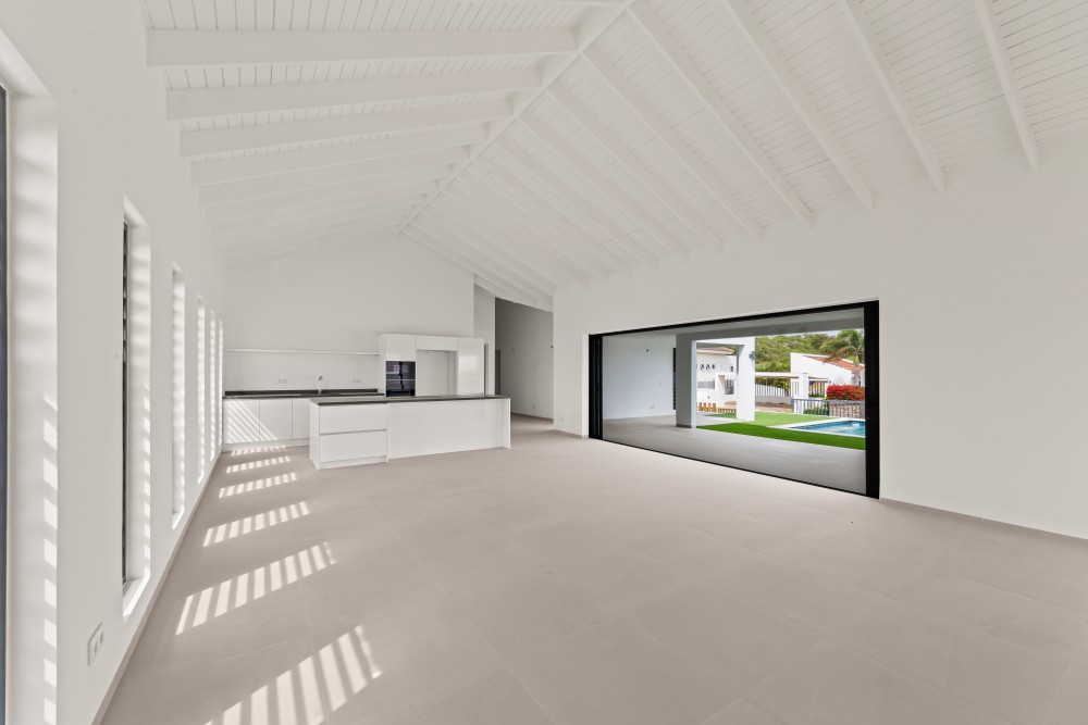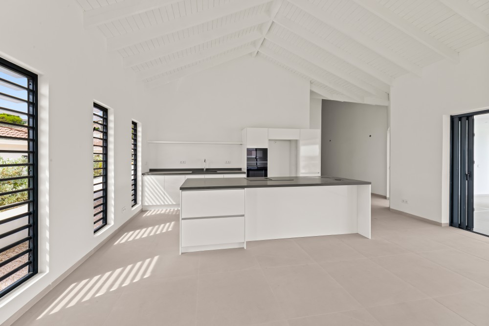Deze centrale ruimte vormt het hart van de woning, waar grote raampartijen zorgen voor veel natuurlijk licht en een naadloze overgang naar het buitenleven. De woonkamer loopt vloeiend over in de keuken, die is uitgerust met moderne voorzieningen en veel opbergruimte, waardoor het een perfecte plek is voor culinaire liefhebbers.