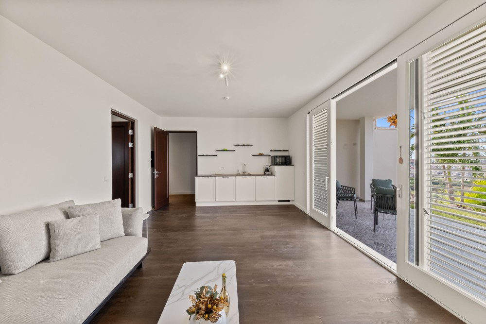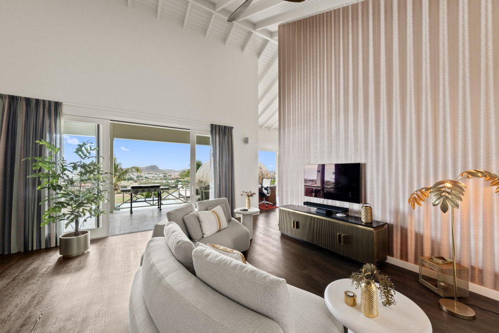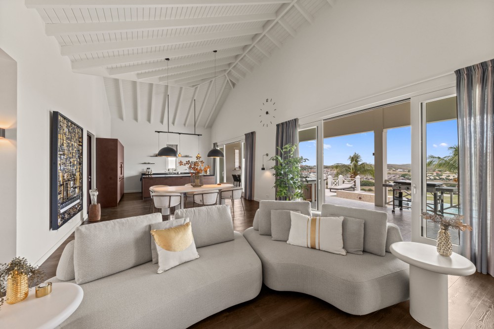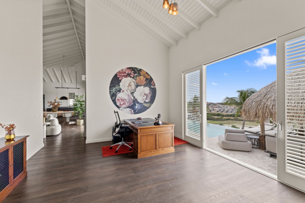 De woonkamer biedt ruimte voor zowel een grote eettafel als een comfortabele zithoek. Via een geïntegreerd Sonos sound system geniet u van muziek, zowel binnen als buiten op het terras. Aangrenzend bevindt zich een kantoor, ideaal om te werken met uitzicht op zee.