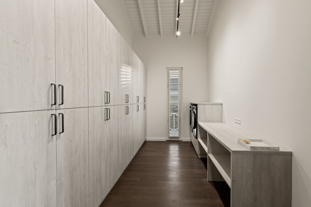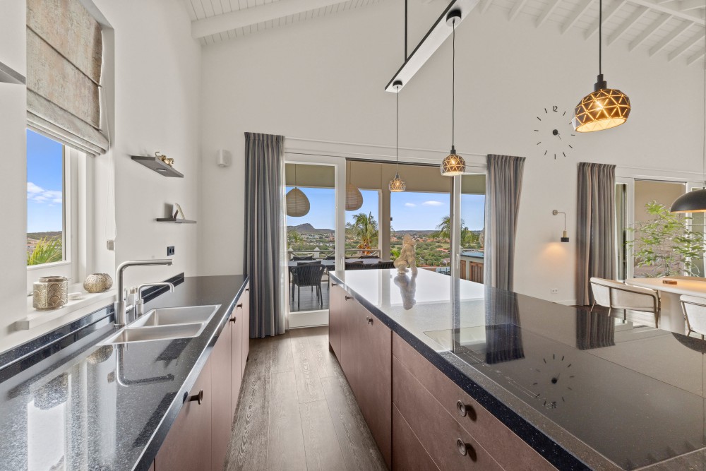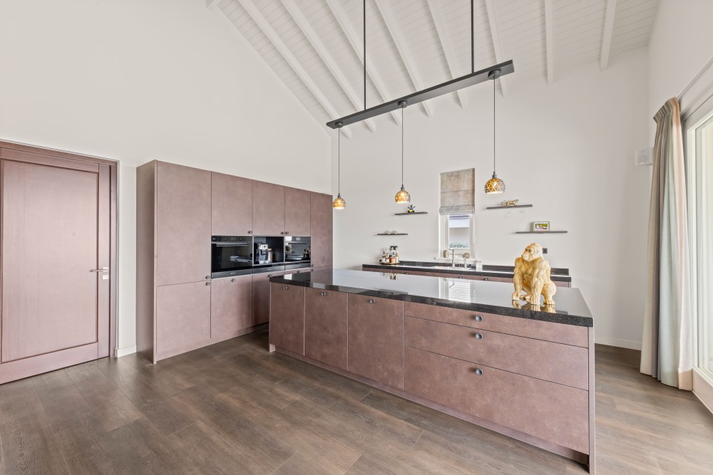 Via de ruime carport bereikt u een fraai aangelegd pad dat leidt naar de dubbele voordeur. Binnen komt u in een lichte hal waar de hoogte, het uitzicht en de royale indeling meteen indruk maken. De woonkamer heeft hoge plafonds, grote raampartijen en schuifpuien die binnen en buiten met elkaar verbinden. De moderne open keuken met kookeiland is volledig uitgerust, inclusief Quooker en hoogwaardige inbouwapparatuur. Direct naast de keuken bevindt zich een pantry/wasruimte met veel bergruimte, werkblad en extra apparatuur zoals een Amerikaanse koelkast.