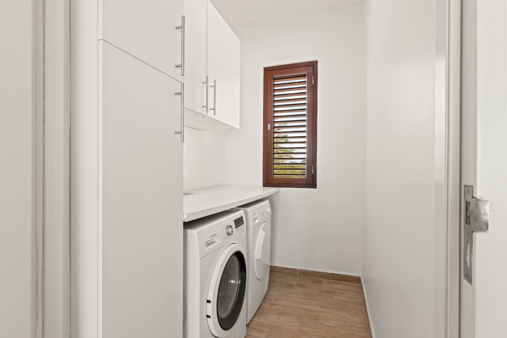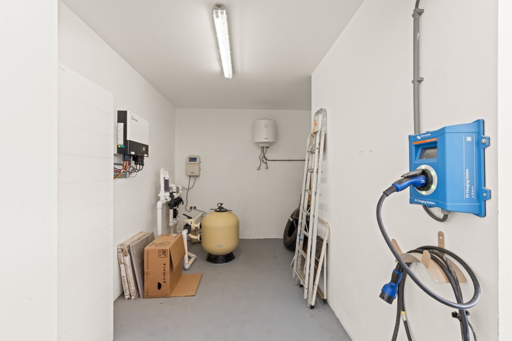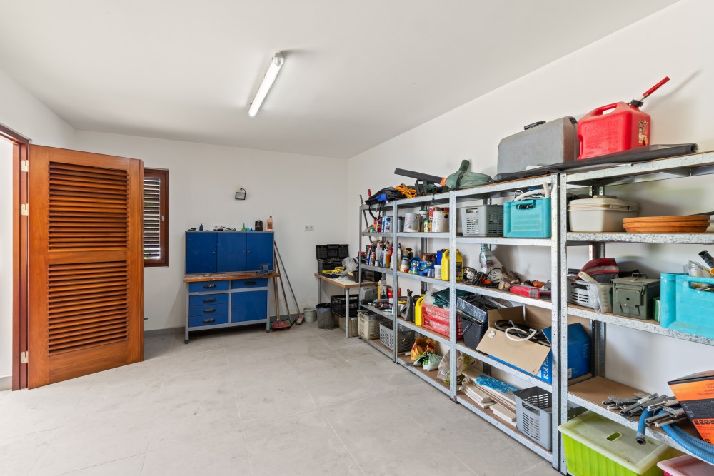 Aansluitend aan deze garage is een ruime werkplaats en opslagruimte gesitueerd waar naar hartenlust geklust kan worden en gebruikt kan worden voor zaken die niet dagelijks nodig zijn. Eveneens bereikbaar vanuit de garage is de technische ruimte voor de zwembadpompinstallatie en de opstelling voor de zonnepaneleninstallatie en thuisbatterij. Zo staat deze apparatuur veilig en droog en minder in het harde Curaçaose weer.