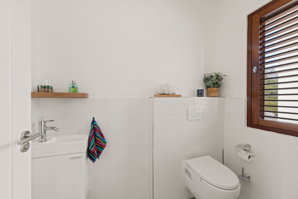 De wasruimte/pantry is een aparte ruimte waar aansluitingen voor wasmachine en droger en opslagmogelijkheden voorzien zijn. Rechts van de hoofdentree is het gastentoilet gelegen.