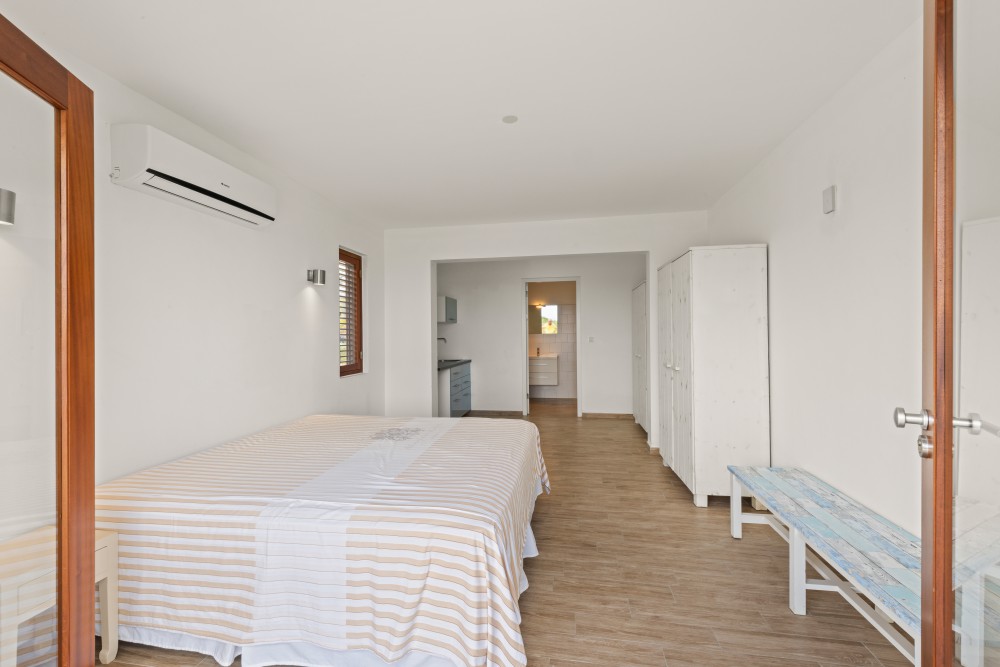 Omliggend aan de woonkamer/keuken bevinden zich de slaapvertrekken en badkamers. Het mastervertrek is gelegen in de rechtervleugel van de villa en bestaat uit een ruime slaapkamer met openslaande deuren naar de porch. De walk-in-closet met kastindeling is een doorloop naar de ruime badkamer, voorzien van inloopdouche, badkamermeubel met dubbele wastafel en vrijhangend toilet.