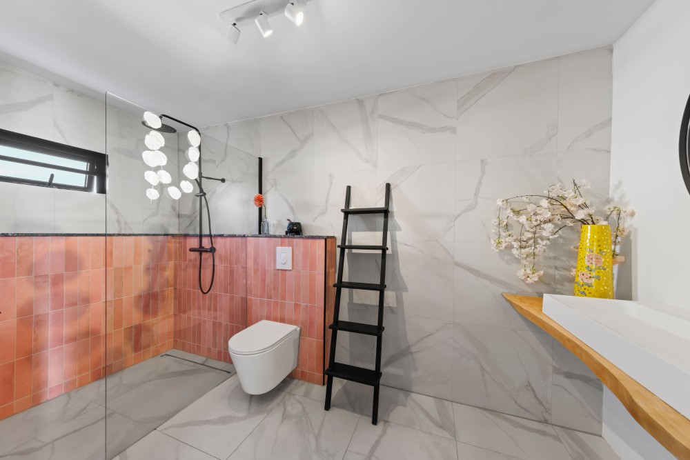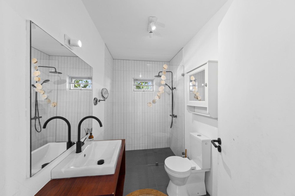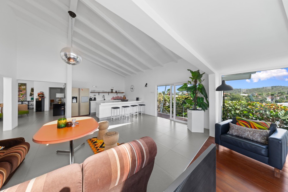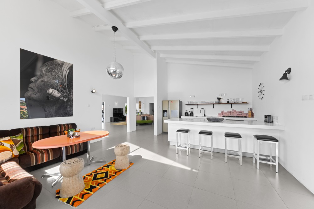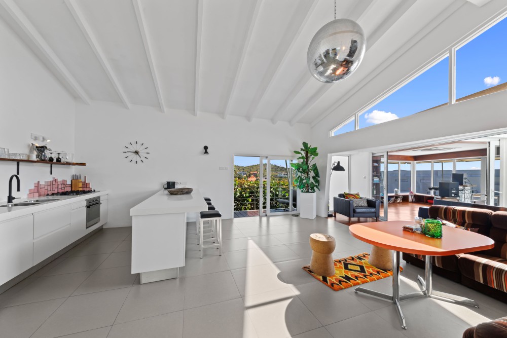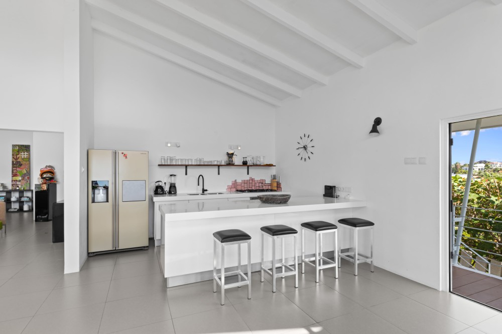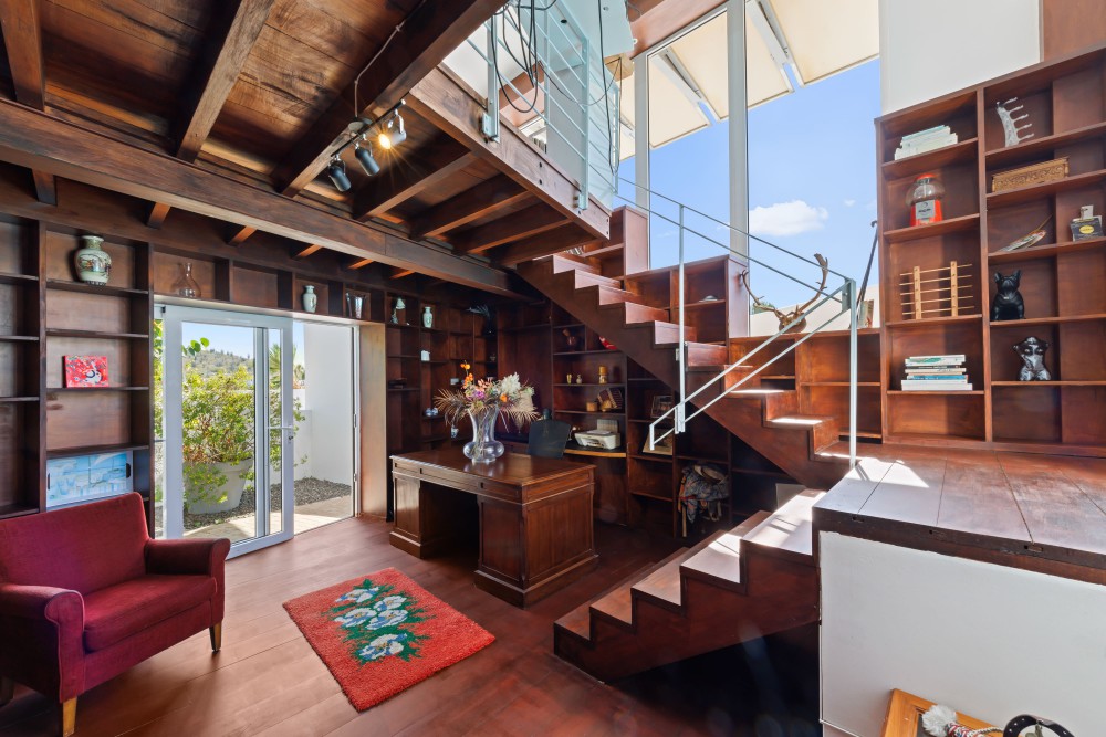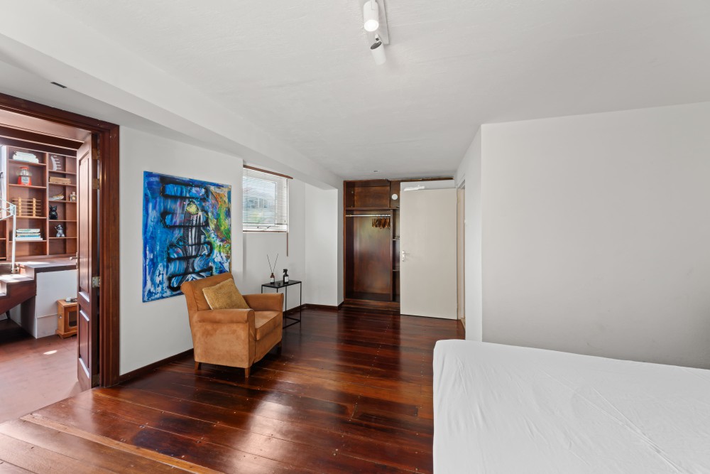 Binnen valt de woonkamer direct op door het hoge plafond, de grote raampartijen en de lichte, open sfeer. Vanuit hier heeft u prachtig uitzicht op de omgeving en de Tafelberg. De moderne keuken grenst aan de woonkamer en is uitgerust met een kookeiland met ontbijtbar, ruime opbergmogelijkheden, een Amerikaanse koelkast, gaskookplaat, inbouwoven en vaatwasser. Vanuit de keuken is er toegang tot een klein terras en een pad rondom de woning.