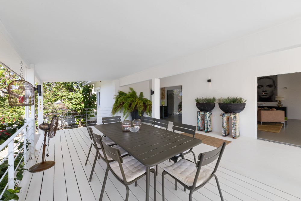 Het perceel is volledig ommuurd en toegankelijk via een dubbele poort, die leidt naar een parkeerplaats voor twee auto’s. Via de andere zijde bereikt u de entree en de overdekte porch, gunstig gelegen op de wind.