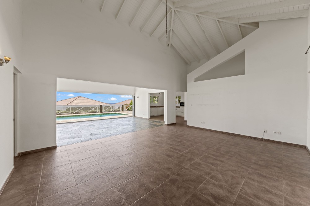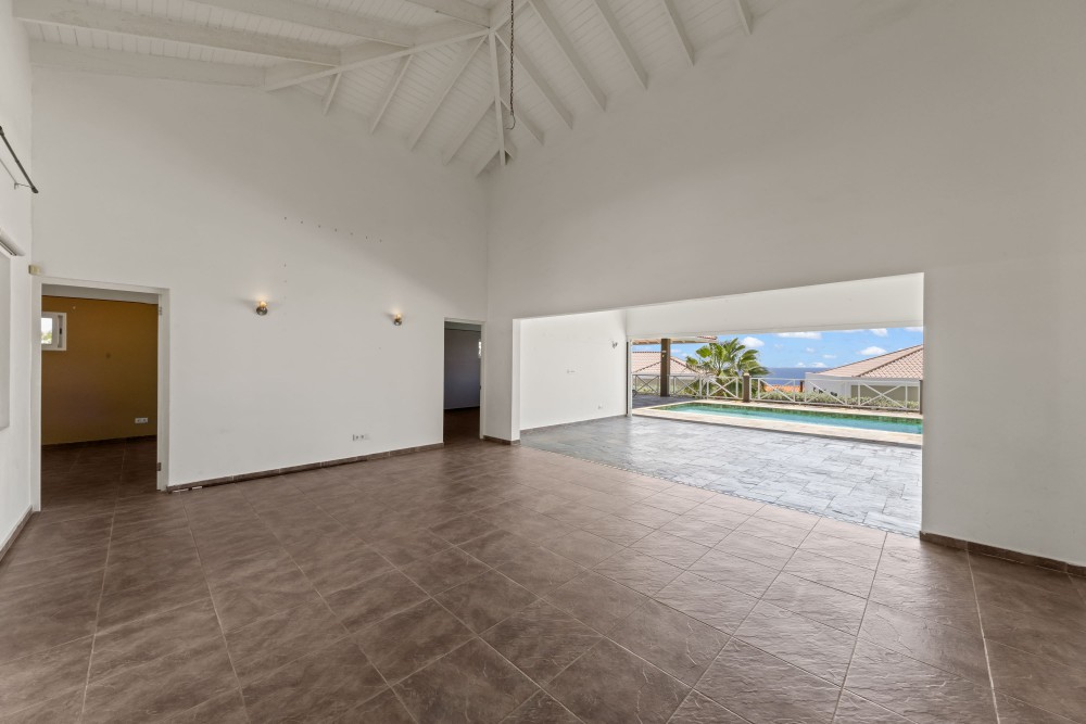 Bij binnenkomst in het huis stap je gelijk binnen in de ruime woon- en eetkamer met een prachtige ‘doorkijk’ over het zwembad en de Caribische Zee. Het hoge plafond in deze ruimte geeft een extra ruimtelijk effect de ruimtes en deze villa. Door de volledig te openen schuifpui ontstaat er één grote leefomgeving zowel binnen en buiten.